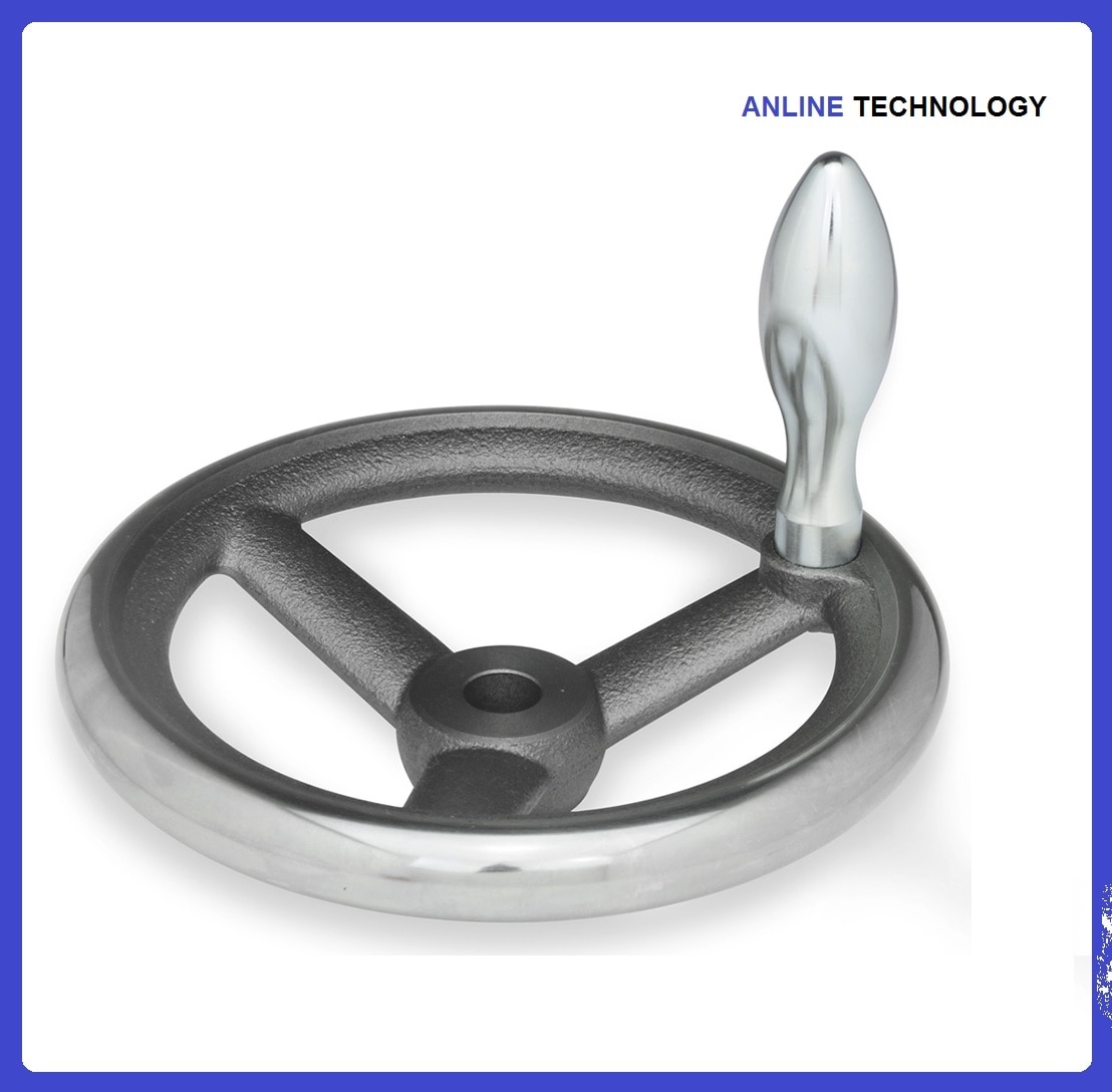 CAST IRON HANDWHEELS WITHOUT REVOLVING HANDLE AND WITHOUT KEYWAY SLOT Material - Handwheel Cast Iron Finish - Wheel Rim Turned and Mirror Polished Revolving Grips - Steel/Aluminium Revolving Handles Revolving Grips - Thermoplastic Handles (Optional) On Request - Different bore sizes, Hubs with square socket, and Power coated Handwheels are available.